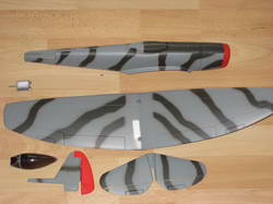 Alle Teile des Modells sind aus Styropor geschäumt und komplett mit dem passenden Finish versehen. Die Tragfläche befindet sich mit bereits eingeklebtem Holm in einem Stück im Karton, der Rumpf ist zweigeteilt.