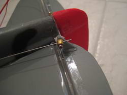 Jetzt werden Regler und Akku an die vorgesehene Stelle im vorderen Teil des Rumpfes untergebracht. Die Anschlüsse werden direkt an die Verbindungsplatte und an den Motor gelötet. Akku und Regler müssen nicht eingeklebt werden, da sie sich nach Zusammenbau der Rumpfhälften nicht mehr vom Fleck bewegen können. Jetzt kommen die 2 Microservos an ihren Platz hinter der Tragflächenbefestigung. Die Anlenkungsgestänge müssen auch gleich in die Servohebel eingehängt werden. Servoseitig geschieht das mit einer Z-Kröpfung der Stangen, Ruderseitig sind die Stangen nur 90 Grad gebogen und werden einfach in die Ruderhörner eingehängt. Das Gestänge ist zweiteilig, verbunden mit Schrumpfschlauch, der nach Einstellung der Nullstellung der Servos und der Ruder einfach fixiert wird. Ich habe hier Ruderseitig zu einem Microgestängeanschluss gegriffen, da mir das einfacher und variabler erscheint.