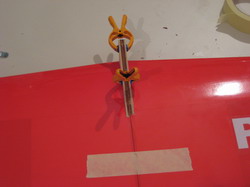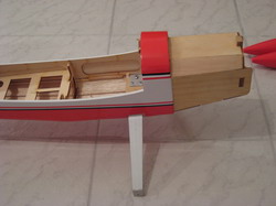 Flächenverbinder rein, alles mit 30min. Epoxy eingestrichen und zusammengefügt. Jetzt habe ich gleich die Befestigungslöcher gebohrt. Beim Einsetzen in den Rumpf viel auf, dass die vordere Befestigungsnase zu viel Spiel hat. Hier musste die Ausnehmung im Rumpf, durch Einlegen eines Sperrholzstückens, verkleinert werden.