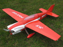 Da ich mich für einen Webra mit 8,3 ccm entschieden habe, war eine eher flottere Gangart zu erwarten. Der Motor läuft gut, Reichweitentest ist auch in Ordnung und alle Ruder funktionieren wie sie sollen. Gas rein und ab damit. Nach kurzem Anlauf hebt sich die Pole Cat in die Luft, steigt flach nach oben und dreht etwas nach links. Etwas Tiefe und Querruder trimmen und sehen was weiter passiert. Nach Erreichen der Ausgangshöhe wird die Ruderwirkungen überprüft. Auf die Querruder spricht sie spontan an und dreht in der Kurve sogar etwas weiter. Höhe und Seitenruderfunktion sind als „normal“ zu bezeichnen. Der nächste spannende Punkt war die Landung. Der Anflug wird angelegt wie sonst auch, Gas raus, reinschweben und ausschweben. Vor dem zweiten Flugversuch habe ich festgestellt dass der Motorspant locker war. Dies könnte auf die stärkere Motorisierung zurückzuführen sein. Hier sollte zur Sicherheit nachgeklebt werden. Weitere Flüge verliefen normal. Dank des starken Motors stellt sich auch richtiges Reno-Racing-Feeling ein.